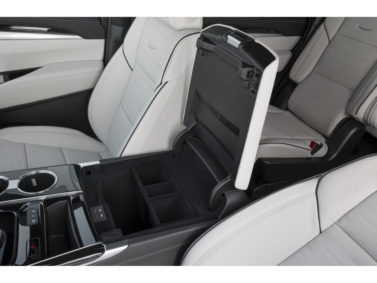 - Console, floor with covered storage, large and small storage bins, dual cup holders, electronic climate controls and second row heated seat controls. Also includes auxiliary power outlet, USB A/C ports and 110-volt outlet (Upgradeable to (DCK) Console refrigerator.)
